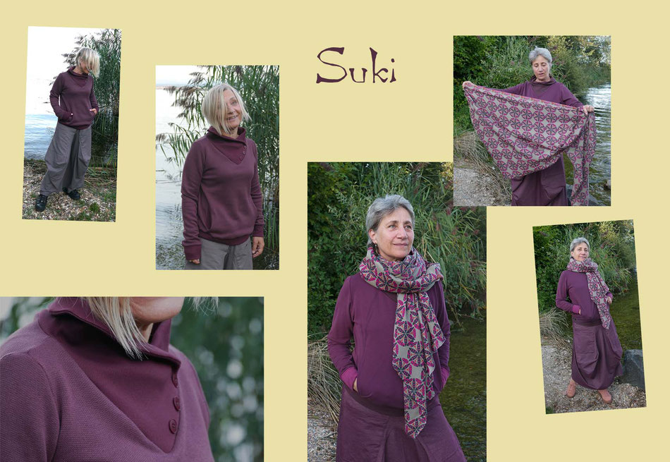 - Pull-Tunique Eliane en "tricot" feuillage de coton bio vert gazon et gris, coton bio prune,